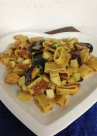 La ricetta di pasta e patate con pomodori secchi e cozze è stata gentilmente fornita da Vittoria Tassoni di VittoriainCucina.